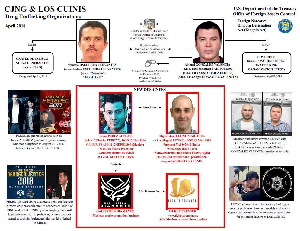 Notimex/La Voz de Michoacán EUA. La Oficina de Control de Bienes Extranjeros (OFAC) del Departamento de Tesoro identificó a dos hombres acusándalos de actuar a nombre de narcotraficantes mexicanos facilitando el lavado de dinero y una red de prostitución internacional. La OFAC designó al promotor musical y ciudadano mexicano Jesús Pérez Alvear como "Narcotraficante Especialmente Designado", por lavar dinero en nombre del poderoso Cártel de Jalisco Nueva Generación (CJNG) y la Organización narcotraficante "Los Cuinis". También designó al fotógrafo de moda venezolano-italiano Miguel José Leone Martínez, y sostuvo que ayuda a dirigir una red de prostitución internacional asociada con "Los Cuinis". El Departamento del Tesoro está identificando a individuos que trabajan a nombre de los jefes narcotraficantes mexicanos violentos, y respaldan sus estilos de vida opulentos mediante el tráfico de drogas letales hacia Estados Unidos”, dijo la subsecretaria de Terrorismo e Inteligencia Financiera, Sigal Mandelker. Nuestra designación de Jesús Pérez Alvear expone su papel ayudando a CJNG y Los Cuinis a explotar la industria musical mexicana para lavar las ganancias de las drogas y glorificar sus actividades criminales”, añadió. Manderker aseguró Leone Martínez dirige una red de prostitución internacional y recluta a modelos y participantes en concursos de belleza de América del Sur y Europa para la prostitución para los miembros principales de "Los Cuinis". Las autoridades mexicanas arrestaron a Miguel Leone con el líder de Los Cuinis, Abigael González Valencia en febrero de 2015 en México, pero liberaron a Leone aproximadamente un año después”, señaló la OFAC. El Departamento de Tesoro indicó que Leone utiliza su papel como fotógrafo de moda para reclutar modelos y participantes en concursos de belleza de América del Sur y Europa para servir como prostitutas para González Valencia y otros miembros principales de "Los Cuinis". Como resultado de la acción, todos los bienes de los hombres designados que estén bajo jurisdicción de Estados Unidos o que estén bajo el control de personas estadunidenses deben ser bloqueados y reportados a la OFAC. Las reglamentaciones de la OFAC generalmente prohíben todas las transacciones de ciudadanos estadunidenses o de personas que se encuentren dentro de Estados Unidos o en tránsito, indicó.