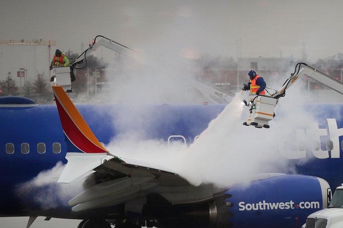 Trabajadores descongelan un avión de Southwest Airlines en Chicago, que se espera que sea una de las ciudades más afectadas por la ola polar.