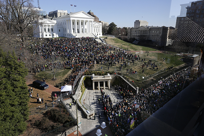 AP / La Voz de MichoacánVirginia, EUA. Miles de activistas a favor de las armas de fuego _ algunos portando sus rifles estilo militar _ llenaron las calles circundantes al Capitolio de Virginia el lunes para protestar contra los planes de la legislatura del estado de aprobar una ley de control de armas. #EEUU‼️?? Declarado el estado de emergencia en #Richmond (Virginia) por una protesta a favor de portar armas a la que acuden cientos de personas con todo tipo de armamento. pic.twitter.com/xJKb6KjoKn — eSPAINews (@eSPAINews) January 20, 2020 El gobernador Ralph Northam declaró un estado de emergencia temporal el día antes del evento, prohibiendo todas las armas, incluyendo pistolas, en el evento en la Plaza Capitolio. La participación esperada de grupos radicales y supremacistas blancos elevaron los temores de otro estallido de violencia como el ocurrido en Charlottesville en 2017. Los manifestantes de Richmond, quienes en su mayoría eran hombres blancos, salieron en grandes cantidades el lunes a pesar del frío. ?? | Manifestantes armados llegan a la manifestación pro armas de Virginia. pic.twitter.com/vJqjuahFZ2 — El Liberal Diario (@ElLiberalDiario) January 20, 2020 El gobierno no nos dirige, nosotros dirigimos al gobierno”, dijo Kem Regik, un agente de seguridad privado de 20 años del norte de Virginia que llevaba una bandera blanca con una imagen de un rifle con la leyenda, “Ven y llévatelo”. Northam era el principal foco de la ira de los manifestantes. Una pancarta mostraba su foto sobrepuesta en el cuerpo de Adolfo Hitler. Muchos de los manifestantes iban en ropa de camuflaje. Algunos ondeaban banderas con mensajes en apoyo al presidente Donald Trump. La asistencia a la marcha fue masiva y sin violencia. Manifestantes declararon que “no queremos que nos metan en ningún registro”. Esta marcha se debió a que Virginia tiene nuevas restricciones a las armas pic.twitter.com/RuGlqHr97u — El Liberal Diario (@ElLiberalDiario) January 20, 2020 Trump, a cambio, tuiteó en apoyo a sus objetivos. El Partido Demócrata en el Gran Estado de Virginia trabaja mucho para quitar sus derechos de la 2da Enmienda”, tuiteó. “Es sólo el inicio. No permitan que suceda, ¡VOTEN REPUBLICANO EN 2020!”. La policía estatal de Virginia, la policía del Capitolio de Virginia y la policía de Richmond tenían fuerte presencia en el lugar, con agentes desplegados en azoteas y otros patrullando en autos y bicicletas. Foto: AP. Activistas a favor de la posesión de armas de fuego en y alrededor de la Plaza Capitolio en Richmond, Virginia. Las autoridades intentaban evitar que se repitiera la violencia que brotó en Charlottesville durante una de las protestas más grandes en una década de los supremacistas blancos y otros grupos de la extrema derecha.