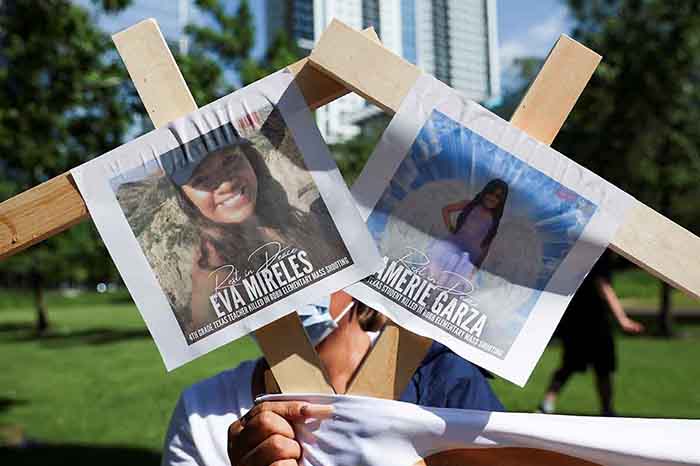 Con fotos de víctimas de Uvalde, manifestantes llegan a convención de Asociación Nacional del Rifle