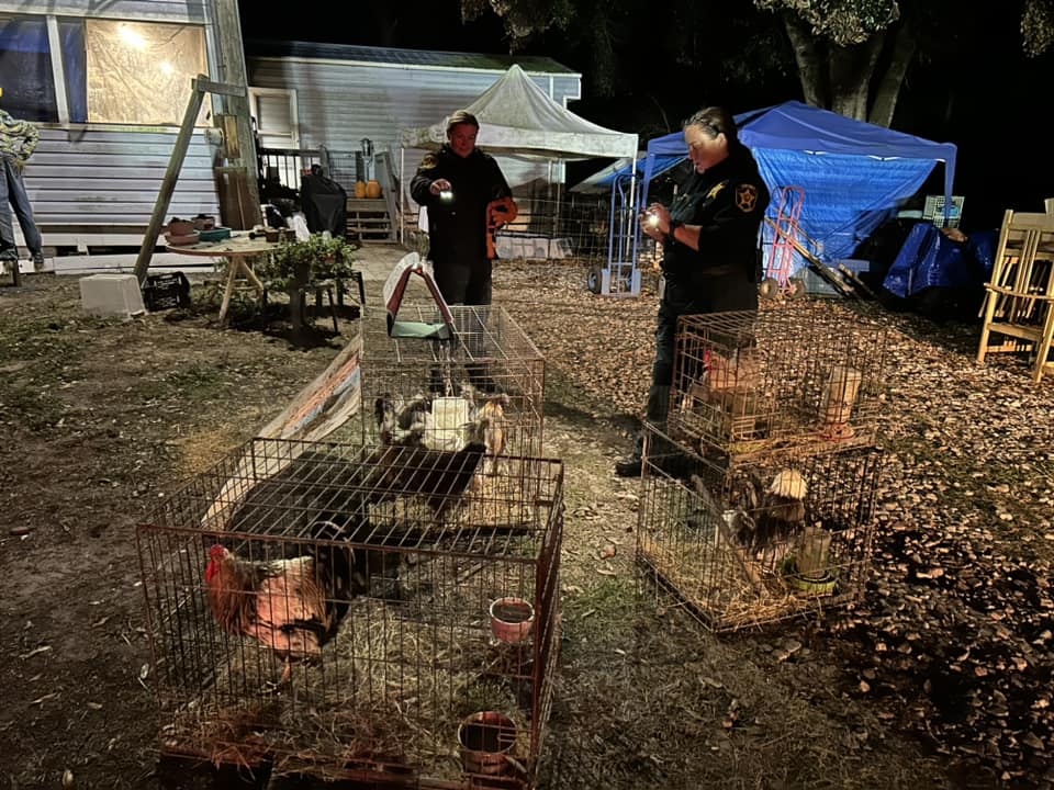 De acuerdo con un comunicado de la oficina del alguacil, "múltiples" aves estaban dentro de jaulas de alambre apiladas en torres de hasta tres niveles en el porche de la entrada de la casa móvil.