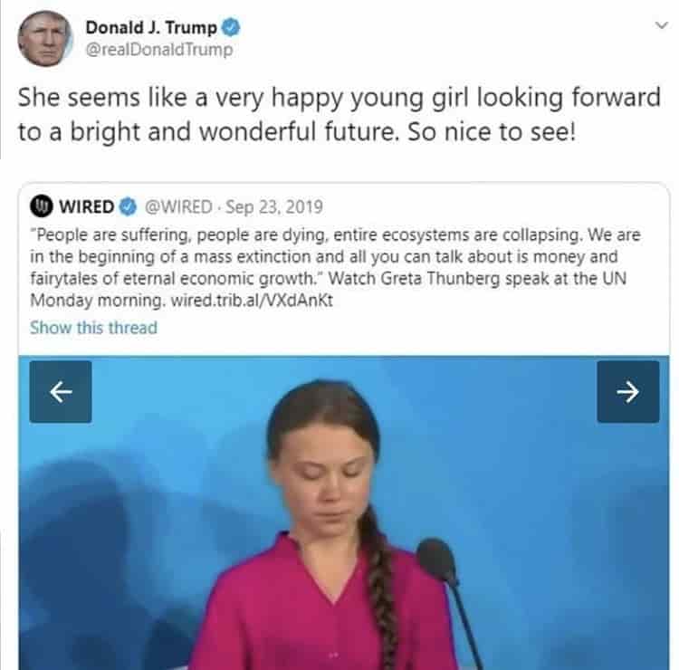 Cabe recordar que en septiembre de 2019, durante la cumbre de clima de la ONU en Nueva York, Trump compartió en Twitter el video del discurso de Thunberg en el que cuestionó a los líderes mundiales por su falta de acción para enfrentar el cambio climático.