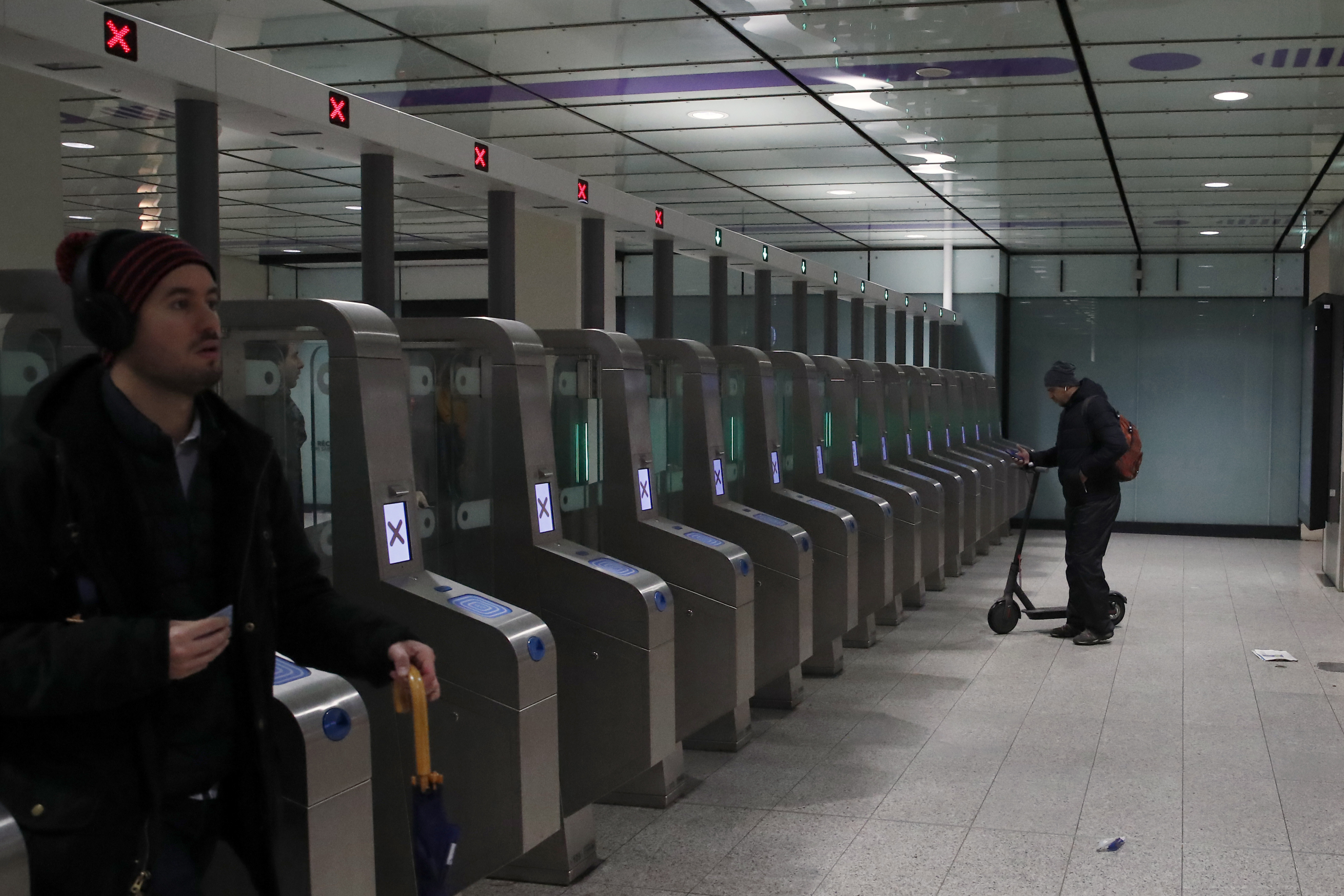 Foto: AP. Un pasajero con un patinete llega a las puertas automatizadas de la estación de Gare Saint Lazare en París.