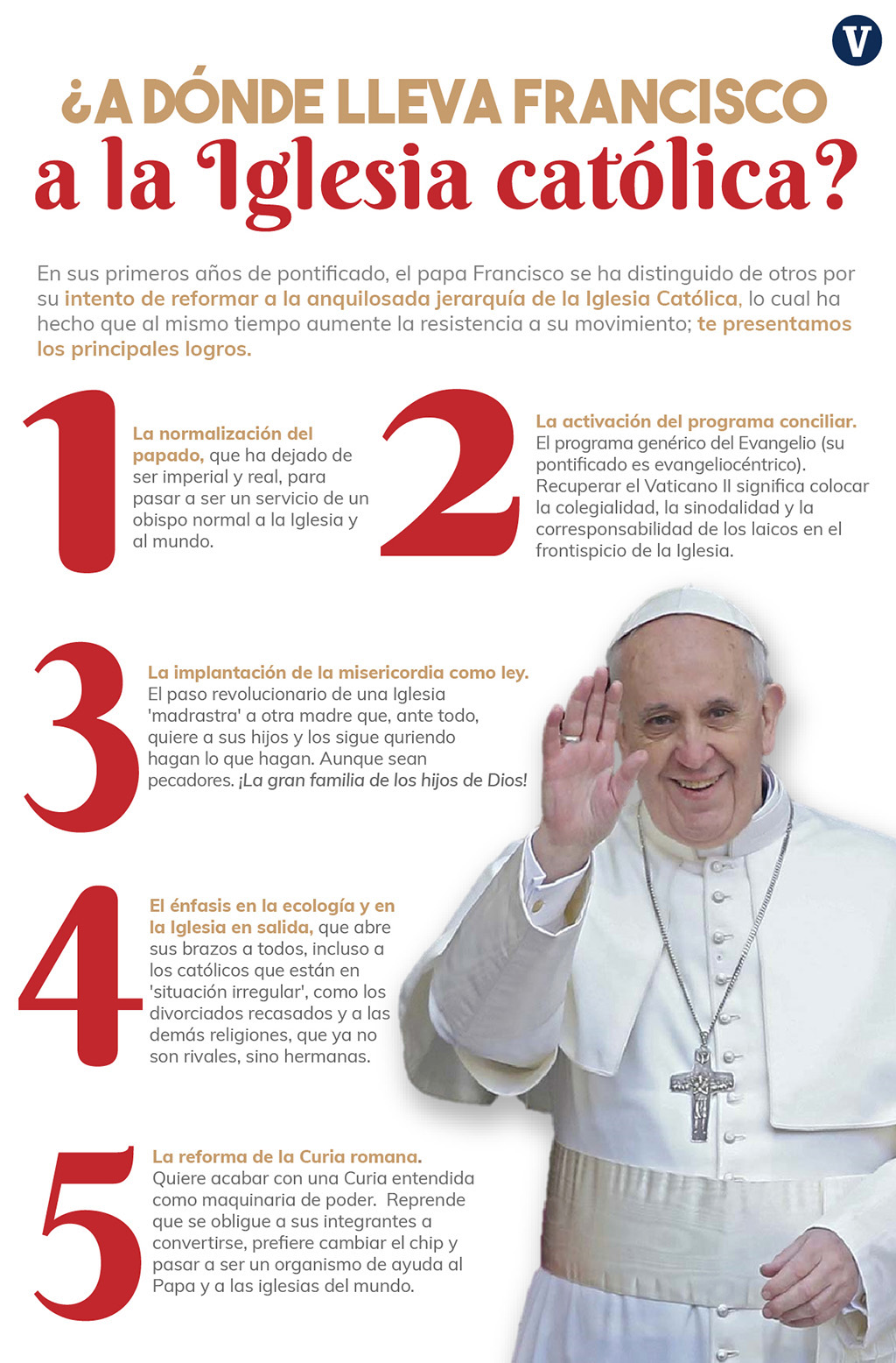 Notimex / La Voz de Michoacán Ciudad del Vaticano. Francisco cumple cinco años de su elección como Papa manteniendo gestos de pastor sencillo cercano a la gente, con la decisión de avanzar en las reformas estructurales del Vaticano y con un sostenido criticismo en su contra, especialmente en sectores “conservadores” de la Iglesia. Como ya es tradición en el actual pontificado, no están previstos actos públicos celebrativos este martes 13 de marzo en la Santa Sede, aunque la mayor parte de las oficinas de la Curia permanecerán cerradas por el feriado que recuerda la fumata blanca de 2013. En el primer lustro de su papado, Jorge Mario Bergoglio reforzó su estilo de pastor cercano, no abandonando nunca los gestos de sencillez que lo mantienen constantemente en relación con los pobres y los excluidos. Entre otras cosas, decidió institucionalizar los “viernes de la misericordia”. Se trata de encuentros a sorpresa que, al menos una vez al mes, sostiene libremente con personas vulnerables de Roma que visita él mismo. Esta costumbre la inició en el Jubileo de la Misericordia, 12 meses de solidaridad que él mismo instituyó entre 2015 y 2016 como celebración para toda la Iglesia. En ese tiempo, se habituó a tener encuentros sorpresivos con enfermos, ancianos, niños y desamparados. La tradición continuó y sumó nuevos sorprendidos: exprostitutas, víctimas de trata de personas, encarcelados y drogadictos en recuperación. Gestos de simpleza pero de gran impacto público, por las imágenes del Papa abrazando, bendiciendo o pasando el tiempo con los más pequeños. “Creo que (Francisco) está teniendo un enorme impacto, quizás en primera instancia se puede pensar que es de emoción, de simpatía y de cercanía espontánea de la gente hacia este Papa, pero creo que está teniendo un gran efecto en el modo de vivir el cristianismo hoy”, afirmó María Voce, presidente del Movimiento de los Focolares. “Siento que es como una revolución, una reforma no sólo de la Curia Romana sino, sobre todo, de la Iglesia católica y de la cristiandad. Un retorno al evangelio puro, una radicalidad mayor y esto lo siento todavía muy fuerte”, agregó en entrevista con Notimex. Esa cercanía se ha multiplicado al infinito con Jorge Mario Bergoglio. No sólo en sus audiencias públicas semanales en el Vaticano, también en sus viajes italianos y al exterior, donde ha podido tomar contacto con millones de personas a lo largo de cinco años. Ese contacto “cuerpo a cuerpo” resulta ser la energía que le permite al Papa argentino afrontar la tarea más ardua de su pontificado: la reforma de la Curia Romana. En diversas ocasiones, él mismo ha reconocido públicamente que uno de los motivos por los cuales fue elegido es para plasmar un profundo cambio en las estructuras burocráticas del Vaticano. No obstante el titánico esfuerzo del propio pontífice, la reforma avanza lentamente. “Un consejo de cardenales fue anunciado el 13 de abril de 2013 para ayudar al Papa en el gobierno de la Iglesia universal y atender otros asuntos, además de tener la misión de proponer la revisión de la constitución apostólica Pastor Bonus”, explicó el cardenal hondureño Oscar Rodríguez Maradiaga.
