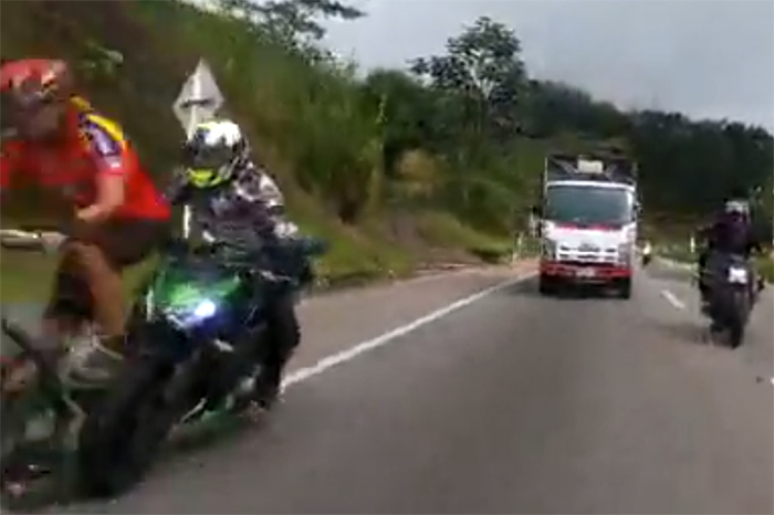 En un momento dado, uno de los conductores de moto empieza a realizar maniobras de rebase a alta velocidad, incluso se mete entre sus compañeros, para luego rebasar por la derecha a un tráiler que iba en ese carril.
