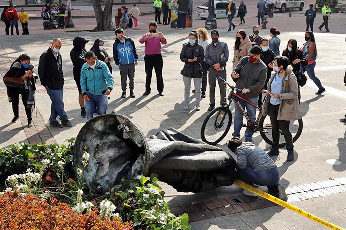 EFE / La Voz de Michoacán Bogotá, Colombia. La estatua del fundador de Bogotá, el conquistador español Gonzalo Jiménez de Quesada, fue derribada este viernes por indígenas del pedestal en que estaba instalada en el centro de la ciudad, como parte de las protestas que desde hace diez días sacuden al país. El monumento a Jiménez de Quesada, que lo muestra con el brazo derecho levantado y sosteniendo la espada hacia abajo, en el acto fundacional, fue derribada por indígenas Misak, la misma etnia que el pasado 28 de abril, en el primer día de las protestas, echó al suelo en Cali la del fundador de esa ciudad, el conquistador Sebastián de Belalcázar. Con tambores y banderas, y coreando vivas a "las autoridades indígenas de Colombia", al "pueblo Misak" y a "las mujeres de Bogotá", un puñado de indígenas llegó esta madrugada hasta el monumento situado en la plazoleta de la Universidad del Rosario, en el centro de Bogotá, para tumbar la estatua. "A partir de este momento no van a tener en Bogotá a este violador, a este supuesto conquistador", proclamó uno de los líderes de los indígenas, según se ve en videos que circulan en redes sociales. https://twitter.com/PrensaGenteCol/status/1390676215107932162?s=20 https://twitter.com/NotiBAdentro/status/1390646998873874434?s=20 https://twitter.com/Col_Informa/status/1390644081089515521?s=20 CONQUISTADOR DE TIERRAS MUISCAS Gonzalo Jiménez de Quesada, nacido en 1509 en Granada (España), según algunos historiadores, aunque otros lo sitúan en Córdoba, fundó en territorios conquistados a los muiscas la villa de Santa Fe de Bogotá, el 6 de agosto de 1538. Esa villa se convirtió en la capital del Nuevo Reino de Granada y posteriormente en la de Colombia. Tras derribar la estatua, los indígenas interpretaron canciones típicas con instrumentos musicales autóctonos y bailaron al lado del pedestal, situado frente a la céntrica Avenida Jiménez, una de las principales de la ciudad, llamada así en homenaje a su fundador, que murió en 1579 en el poblado de Mariquita, en el centro del país, mientras avanzaba en su campaña conquistadora. "Un grupo de vándalos derribó la estatua de Gonzalo Jiménez de Quesada en la plazoleta el Rosario de Bogotá. Total rechazo contra este tipo de actos delictivos que atentan contra los bienes públicos de la cultura", manifestó en Twitter el ministro de Cultura de Colombia, Felipe Buitrago. Los Misak, que habitan principalmente el departamento del Cauca, también derribaron el 17 de septiembre del año pasado en Popayán, la capital regional, la estatua de Sebastián de Belalcázar, fundador de esa ciudad del suroeste del país. Desde hace diez días Colombia vive una ola de manifestaciones callejeras contra el Gobierno del presidente Iván Duque que deja hasta el momento al menos 24 personas muertas, la mayor parte de ellas por la violencia policial, según datos oficiales, aunque otras fuentes, como la ONG Temblores, eleva esa cifra a 37 fallecidos.