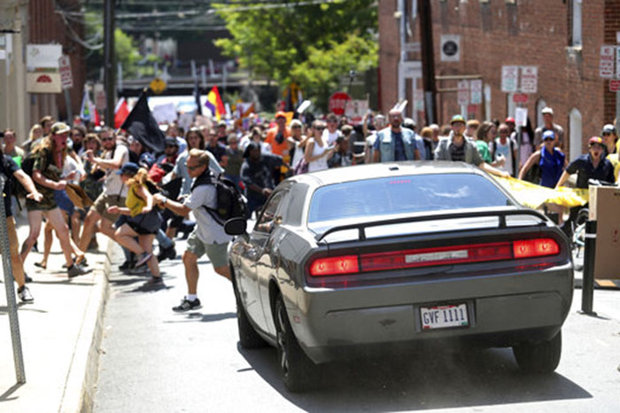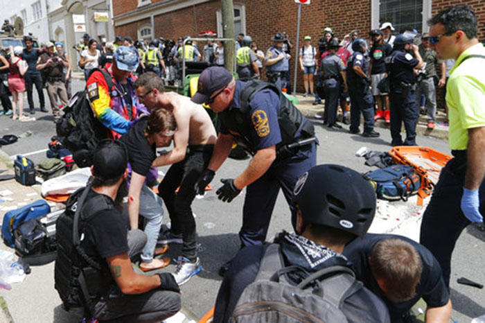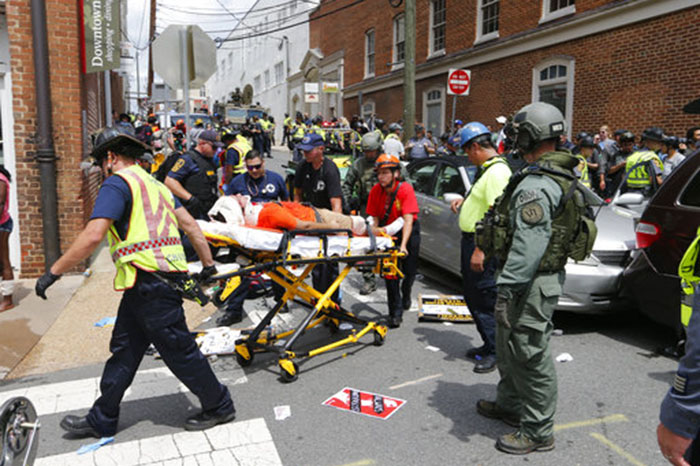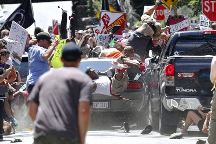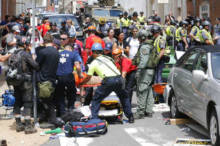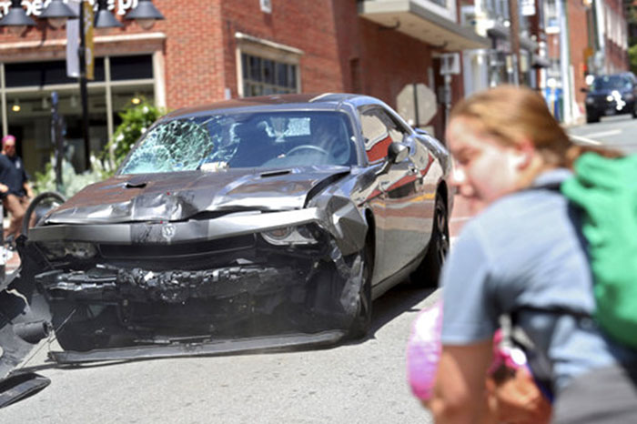 Mundo | 12 Ago, 2017, 19:49 Violencia en Charlottesville Virginia La Voz de Michoacán. Las últimas noticias, hoy. Foto: AP Individuo a bordo de este automóvil se lanzo contra la multitud en Charlottesville. - + Foto: AP Trágico fin de marcha en Virginia Foto: AP Individuo a bordo de este automóvil se lanzo contra la multitud en Charlottesville. Foto: AP El automóvil inmediatamente después de atropellar a decenas de personas e impactar a otros vehículos se dio a la fuga en reversa. Foto:AP Los heridos son auxiliados por sus compañero Foto: AP Los cuerpos de rescate hacen presencia en el lugar Foto: AP Cuerpos de rescate ayudan gente herida después de que un carro atropello una marcha de protesta en Charlottesville Virginia PUBLICIDAD