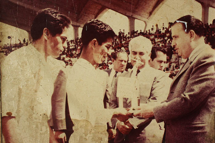 El Lic. Carlos Gálvez Betancourt Gobernador de Michoacán en compañía del Dr. Melchor Ortiz Rubio Presidente Municipal de Morelia, entrega el trofeo a Manuel Herrera Márquez correspondiente al subcampeonato del equipo Sevilla temporada 1968-69. Foto, archivo de Samuel Herrera Delgado.