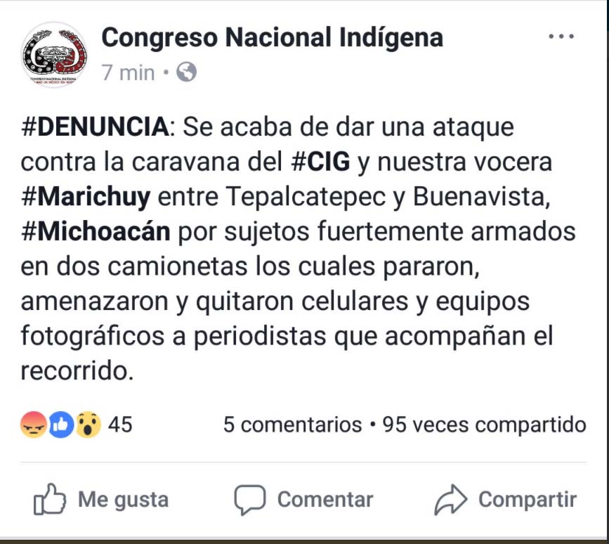 La Voz de Michoacán Tepalcatepec,Michoacán. El Congreso Nacional Indígena reportó un ataque a la caravana en donde viaja la aspirante independiente a la presidencia de la República, María de Jesús Patricio Martínez, conocida como Marichuy, en el estado de Michoacán. En su cuenta de twitter señaló que un grupo de hombres fuertemente armados quienes viajaban en dos camionetas interceptaron a la caravana entre Tepalcatepec y Buenavista amenazaron y quitaron celulares y equipos fotográficos a los periodistas que acompañan en el recorrido. “Por el momento vamos en carretera a su encuentro, exigimos garantías de seguridad para la caravana y para nuestra vocera. Pedimos estén alerta por la seguridad de nuestros compañeros”, escribió el colectivo. Marichuy, quien se encuentra de gira por el estado de Michoacán, visitó la comunidad de Santa María Ostula, ubicada en el municipio de Aquila, el cual es acechado por grupos del crimen organizado y autodefensas. Horas antes del ataque, la precandidata indígena aseguró que si bien no habían existido amenazas directas del crimen organizado en su contra ni a su equipo indicó que la intimidación es una realidad que viven los indígenas quienes son presionados a ceder de sus recursos. “Es lo mismo, el gobierno y el crimen organizado, para infundir temor y miedo”, dijo en conferencia de prensa. Con información de Sin Embargo.