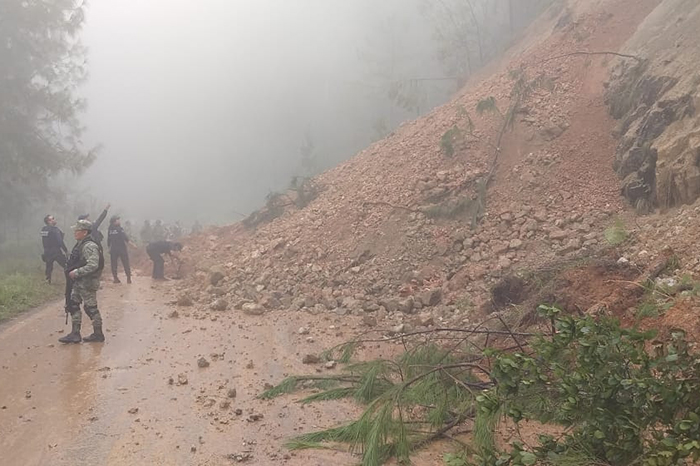 Chinicuila, Michoacán. Con la premisa de garantizar la integridad física de la población, personal de las secretarías de Seguridad Pública (SSP), y de la Defensa Nacional (Sedena), realizan labores de tránsito en la carretera Chinicuila-Aquila, tras un derrumbe registrado en la zona, el cual mantiene bloqueada la circulación en ambos sentidos.