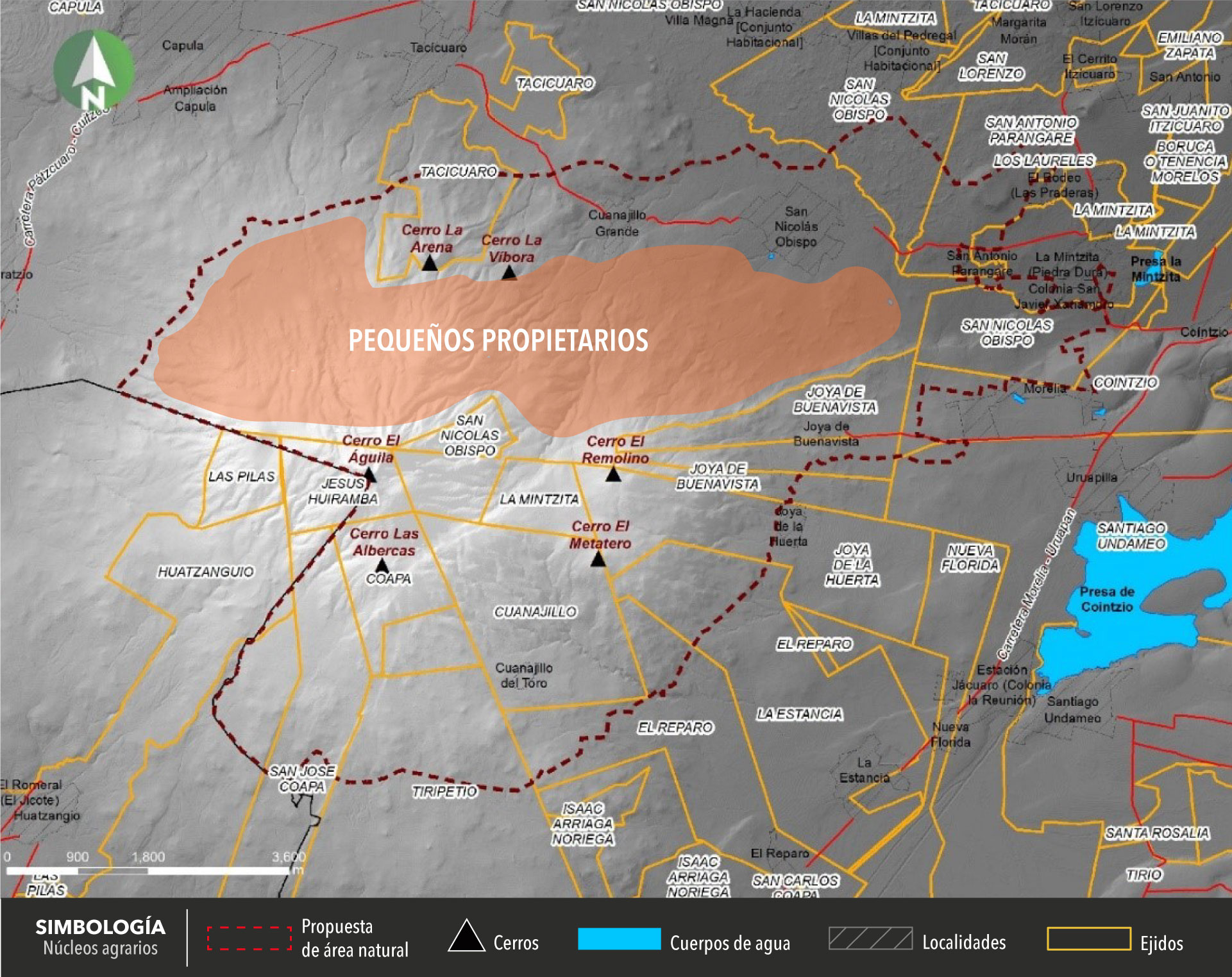En el área natural del Cerro del águila hay 18 ejidos: Coapa, Cointzio, Cuanajillo, El Reparo, Huatzanguio (municipio de Lagunillas), Jesús Huiramba (municipio de Huiramba), Joya de Buenavista, Joya de la Huerta, La Estancia, La Mintzita, Las Pilas (municipio de Lagunillas), Los Laureles, San Antonio Parangare, San José Coapa, San Nicolás Obispo, Santiago Undameo, Tacícuaro y Tiripetío. De esos, sólo Joya de Buenavista y San José Coapa tienen clasificación forestal; es decir, sólo 486.85 hectáreas de las 2 mil 881.63 que abarcan los ejidos. Todos los demás están dedicados a la agricultura.