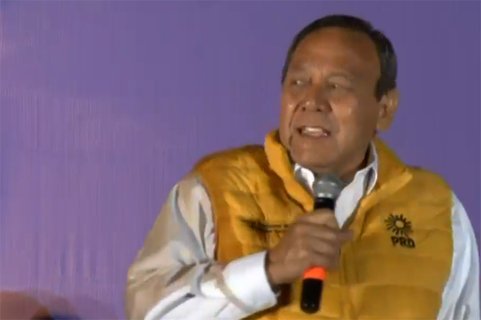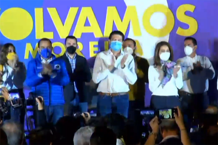 En el evento estuvo arropado por Marko Cortés y Jesús Zambrano, líderes nacionales del PAN y el PRD, respectivamente, entre otros liderazgos partidistas.