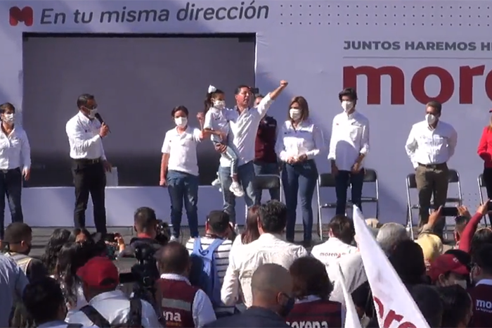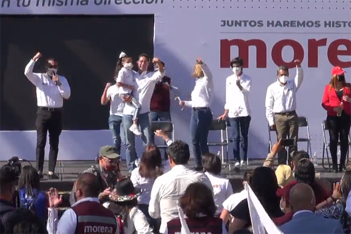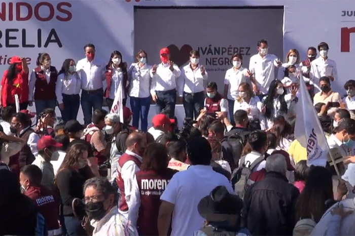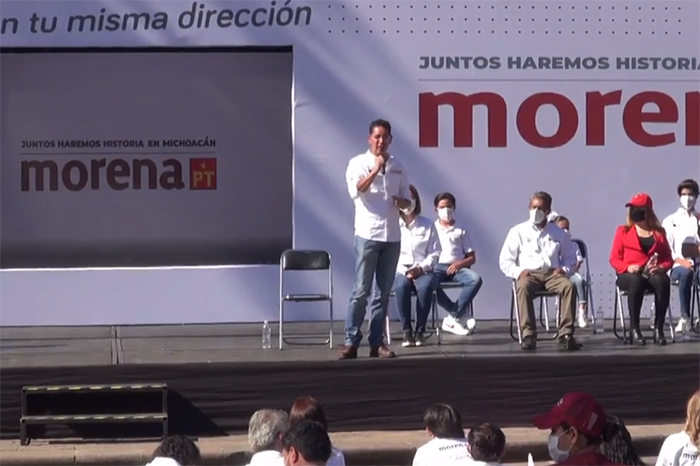 Su arranque de campaña fue durante la mañana de este lunes en la Plaza Jardín Morelos, conocida como El Caballito. El primer orador en el evento fue Raúl Morón Vidal, quien, además de resaltar las virtudes de la cuarta transformación, lanzó porras a su padre, el alcalde de Morelia con licencia cuya candidatura no se concretó por omisiones en la fiscalización.