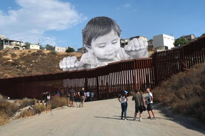 Artista levanta niño gigante en muro de EUA y México