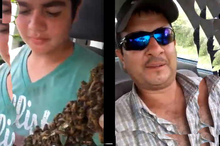 Apicultor mexicano y su hijo rescatan un enjambre de abejas y lo meten al auto