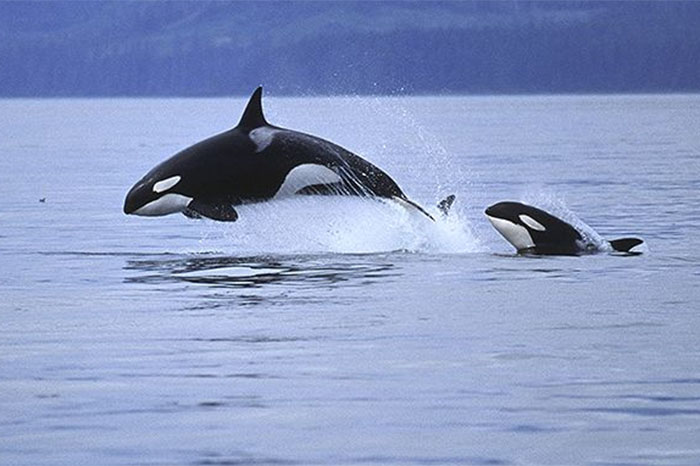 Una familia de orcas acompaña y juega junto a una nadadora en el mar