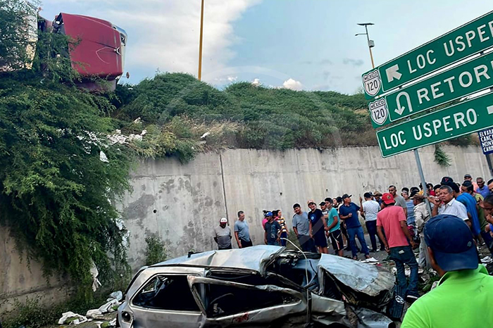 Auto cae de puente tras choque contra camión en carretera Apatzingán-Cuatro Caminos
