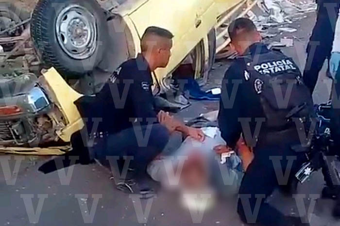Choque doble en la "Siglo XXI" provoca volcadura de camioneta y queda pareja herida