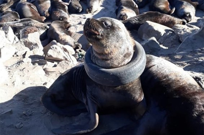 Intentan rescatar a un lobo marino con una llanta atorada en el cuello