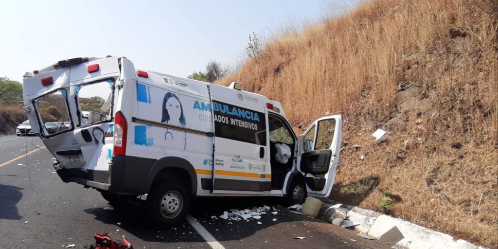 Redacción / La Voz de Michoacán Taretan, Michoacán. Dos personas resultaron gravemente heridas al chocar la ambulancia en la que se trasladaban, contra un tráiler sobre la autopista Siglo XXI, en las inmediaciones de esta demarcación de Taretan. El aparatoso accidente tuvo lugar a la altura del kilómetro 105, cerca de la desviación de la comunidad de La Purísima, donde un camión de carga de color rojo colisionó la unidad de emergencia, misma que terminó destruida y dentro quedaron gravemente sus dos ocupantes, uno de ellos un paramédico A la zona se movilizaron paramédicos de Bomberos de Rescate Uruapan, quienes atendieron a las a los afectados, solicitando el apoyo con un helicóptero del gobierno para realizar el traslado de los afectados a Morelia, debido a la gravedad de su estado de salud. La zona fue resguardada por uniformados, en tanto que de los respectivos peritajes se hicieron cargo las autoridades competentes, mismas que habrán de determinar responsabilidades sobre lo ocurrido.