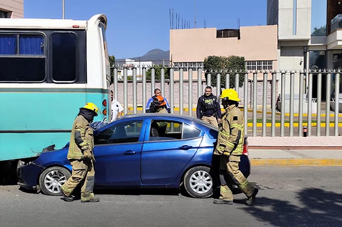 Redacción / La Voz de Michoacán Morelia, Michoacán. Un auto compacto chocó contra la retaguardia de un camión de pasajeros sobre la Calzada La Huerta, en las cercanías del Obelisco a Lázaro Cárdenas. El incidente, afortunadamente, no dejó personas lesionadas, informaron fuentes de rescate. El percance ocurrió la tarde de este domingo, en el sentido del citado monumento hacia la salida a Pátzcuaro, justo a la altura de la barda perimetral del Supremo Tribunal de Justicia del Estado de Michoacán, ubicado en la colonia Nueva Valladolid. Trascendió que el vehículo compacto quedó atorado en la parte posterior de la unidad del transporte público de la tuta "Autotransportes del Canje", colores blanco con verde. En el sitio se presentaron bomberos estatales para apoyar en las labores de auxilio. Asimismo, unos agentes de Tránsito se encargaron del peritaje correspondiente para deslindar responsabilidades.