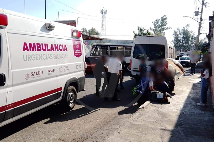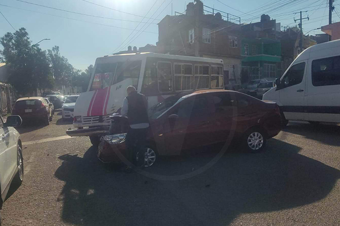 Redacción / La Voz de Michoacán Morelia, Michoacán. Un camión de la Ruta Alberca, el cual aparentemente se quedó sin frenos, chocó contra un automóvil cuyos ocupantes resultaron lastimados, percance que ocurrió en la colonia moreliana Profesor Jesús Romero Flores. De acuerdo con las autoridades policiales y de rescate, lo anterior sucedió durante la tarde de este martes sobre la calle Circuito Educadores Mexicanos. El incidente de inmediato fue alertado al número de emergencias. Foto: La Voz de Michoacán. En el sitio se presentaron unos paramédicos, quienes atendieron a tres menores y a dos mujeres adultas, quienes sufrieron golpes mínimos y crisis nerviosa, ellos no requirieron traslado hospitalario. Se apreció que el referido transporte del servicio público es uno blanco con franja rosa, número 94 y placa A35871N. La otra unidad perjudicada es de la marca Chevrolet color guinda, la cual terminó con la parte frontal destrozada. Agentes de la Guardia Civil de Tránsito y Movilidad realizaron el peritaje correspondiente para deslindar responsabilidades, luego los automotores siniestrados fueron retirados por una grúa. Foto: La Voz de Michoacán.