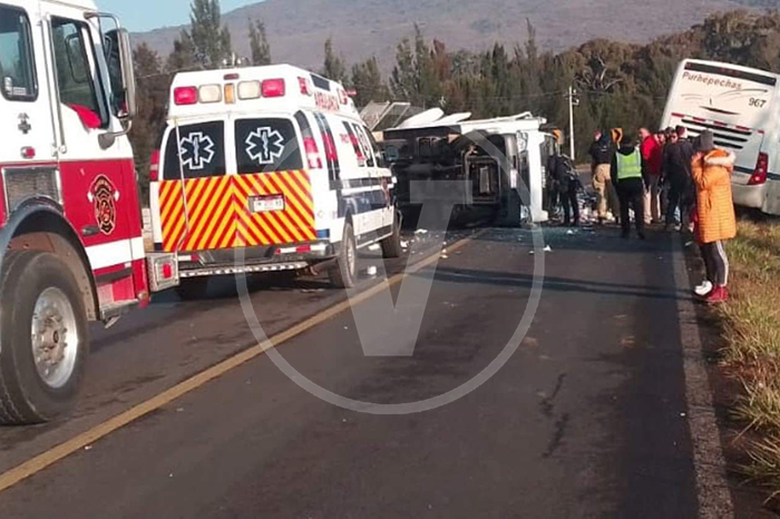 Redacción / La Voz de Michoacán Tangancícuaro, Michoacán. La mañana de este lunes se registró un aparatoso choque-volcadura entre un autobús y un camión repartidor de lácteos, el cual dejó como saldo cuantiosos daños materiales y al menos dos heridos. La emergencia tuvo lugar, sobre la carretera Zamora-Morelia a la altura de la curva de "Las Adjuntas", hasta donde se movilizaron agentes de la Guardia Civil para abanderar la zona y evitar otro percance. Paramédicos de Protección Civil y Bomberos Municipales se encargaron de revisar y valorar a varios tripulantes del autobús los cuales no requirieron ser hospitalizados. Asimismo, auxiliaron al conductor de la unidad de pasajeros Carlos G., U., de 52 años de edad, vecino del Fraccionamiento Primaveras del municipio de Uruapan y a Luis Ángel P., A., de 29 años de edad, vecino del Infonavit Arboledas Segunda Sección de Zamora, conductor del camión de carga, los cuales fueron llevados a diversos nosocomios de Zamora. Las unidades involucradas son, un autobús tipo marco polo, de la línea Purhépechas, marcado con el número 967, con placas 87HA3A del Servicio Público federal y un camión Isuzu, color blanco, con placas MZ-1641-A de Michoacán propiedad de Sigma Alimentos, el cual terminó volcado sobre la carpeta asfáltica. Elementos de Tránsito Estatal se encargaron de los peritajes correspondientes y dejaron las unidades a disposición de la autoridad competente, donde se determinarán responsabilidades.
