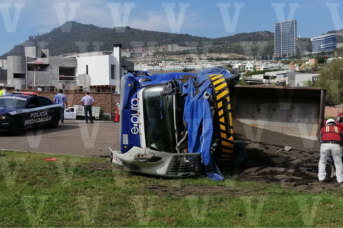 Redacción / La Voz de Michoacán Morelia, Michoacán. Dos hombres resultaron heridos cuando un camión tipo volteo se estrelló contra un vehículo repartidor de agua e'pura, esto en el complejo de Ciudad Tres Marías, municipio de Morelia. Tras el impacto, ambos automotores quedaron volcados, uno de ellos pertenece a la empresa "TH Edificación Acelerada", el cual estaba cargado con arena; es una unidad de la marca Kenworth, color blanco y placa MT6864A. El otro transporte perjudicado es de la referida marca de agua y tiene la matrícula de circulación 8620CM. Se supo que los lesionados son: Manuel y José Luis, de 30 y 34 años de edad, respectivamente. El accidente fue reportado por unas personas al número de emergencias 911, después acudieron bomberos de Protección Civil Estatal, así como paramédicos municipales y del Centro Regulador de Urgencias Médicas, quienes ayudaron a los lastimados y los canalizaron a un hospital. Información extraoficial reveló que el volteo descendía una pendiente, en el trayecto presuntamente tuvo una falla mecánica, se salió de control y sucedió el incidente con el saldo ya comentado. Agentes de la Policía Michoacán de Tránsito y Movilidad, adscritos al departamento de Peritos, arribaron a la escena y efectuaron el correspondiente estudio técnico de los hechos para determinar responsabilidades.