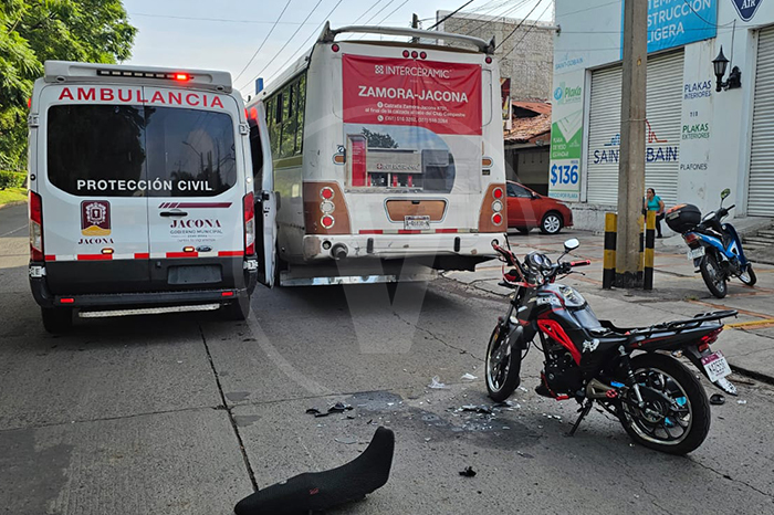 Redacción / La Voz de Michoacán Jacona, Michoacán. Un joven sufrió posible trauma de cráneo y golpes en otras partes del cuerpo, al impactar su motocicleta por alcance contra un camión de pasajeros de la Ruta Café, cuyo conductor esperó al arribó de las autoridades. El accidente se registró en la calzada Zamora-Jacona a unos metros del Fraccionamiento El Ensueño, hasta donde llegaron paramédicos de Protección Civil Municipal para auxiliar al lesionado. El lesionado es el joven Santiago Ignacio O., H., de 23 años de edad, vecino del Fraccionamiento San Agustín de este municipio de Jacona, el cual fue canalizado a la sala de urgencias de un hospital de Zamora para su adecuada atención médica. Elementos de Tránsito Municipal se encargaron de los peritajes y aseguraron la motocicleta accidentada de la marca BDS color negro con rojo, con placas K4Z55F y el microbús Mercedes Benz, con placas A-46838-N, mientras se determinan responsabilidades.