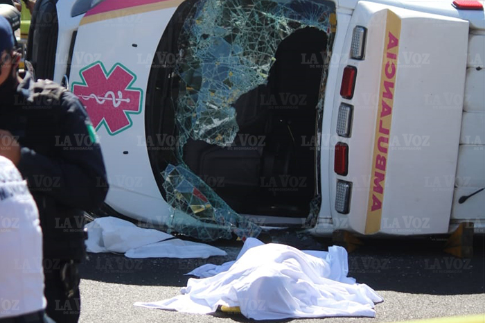 Redacción / La Voz de Michoacán Morelia, Michoacán. Un paciente que era trasladado a bordo de una ambulancia murió luego de que la unidad chocó contra un automóvil particular en el cruce de la avenida Camelinas y la calzada Ventura Puente, en Morelia. El paciente era trasladado en la unidad de emergencias desde el municipio de La Huacana a un hospital en Morelia para que recibiera atención médica, sin embargo, murió tras salir proyectado de la ambulancia tras el choque, que ocurrió a pesar de que la ambulancia llevaba activados los códigos de emergencia. El percance dejó 5 heridos: el operador de la ambulancia, dos paramédicos y dos acompañantes, mientras que el automovilista, quien también recibió los primeros auxilios, fue subido a una patrulla de la policía. La ambulancia pertenece a la Secretaría de Salud de Michoacán y el automóvil particular es un Nissan Versa de modelo reciente, el cual quedó destrozado del frente. El tráfico fue suspendido parcialmente en la zona, la cual fue acordonada por elementos de la Policía de Morelia, por lo que se registra tráfico pesado. Ambulancias del sector privado llegaron al sitio para tratar de ayudar a los afectados. Foto: Christian Hernández, La Voz de Michoacán.Foto: Christian Hernández, La Voz de Michoacán.Foto: Christian Hernández, La Voz de Michoacán.Foto: Christian Hernández, La Voz de Michoacán. La Secretaría de Salud de Michoacán (SSM) informó que las dos familiares del paciente que murió, quienes resultaron lesionadas en el percance, fueron trasladadas al Hospital de la Mujer para recibir atención médica. De acuerdo con el reporte de los médicos del hospital en el que se atiende a las mujeres lesionadas, ambas se encuentran estables; dos paramédicos, que también resultaron heridos, ya reciben atención médica. La SSM detalló que el paciente que falleció era trasladado desde el municipio de La Huacana al hospital Star Médica de la capital michoacana. En relación a la ambulancia siniestrada, la SSM informa que ésta se encuentra bajo resguardo del Ayuntamiento de La Huacana.