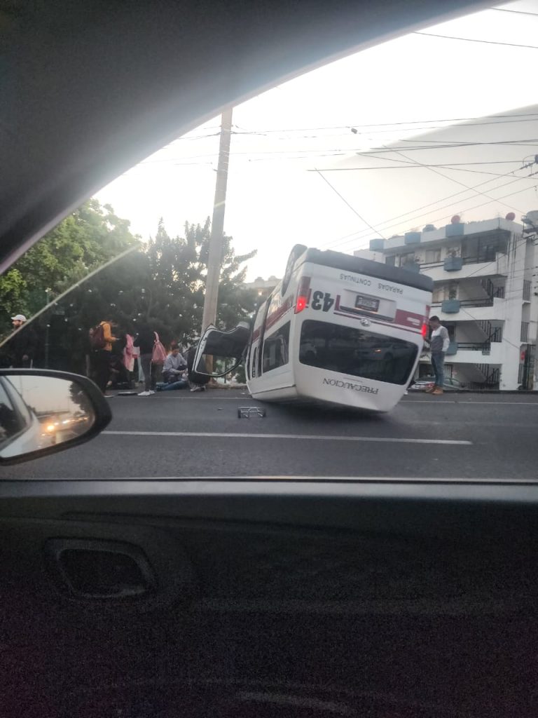 El aparatoso incidente se registró en el sentido de Fuentes de Morelia hacia Casa Michoacán, donde terminó volcada una camioneta de la Ruta Guinda, con número económico 43.