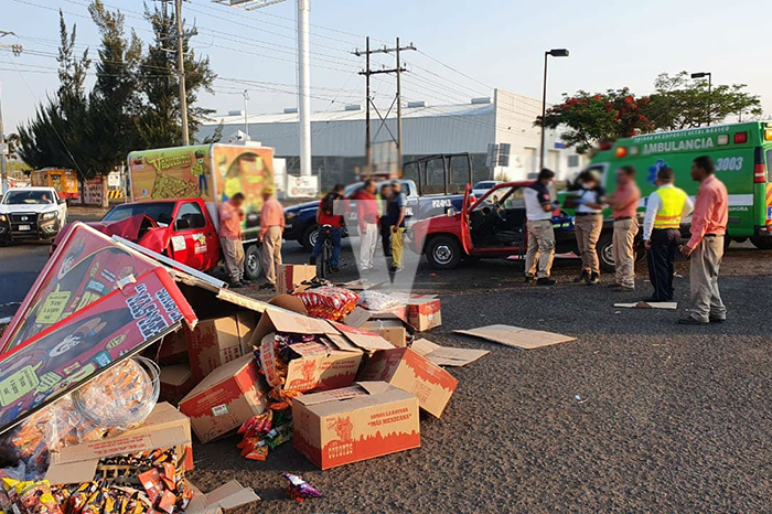 Redacción / La Voz de Michoacán Zamora, Michoacán. La mañana de este miércoles, se registró un aparatoso choque entre dos camionetas de la empresa de frituras "Rancho Los Coyotes", dejando como saldo a ambos conductores con golpes leves, además de generar cuantiosos daños materiales. El percance vial ocurrió sobre la carretera Zamora-La Barca, a la altura del Hotel City Express, hasta donde llegaron los elementos de Tránsito Municipal para abanderar y realizar los peritajes correspondientes. Al sitio también arribaron los paramédicos de Rescate y Salvamento para brindarle los primeros auxilios a Juan Rodolfo V., V., de 28 años de edad, vecino del Fraccionamiento Altamira y a Juan Manuel G., P., de 37 años de edad, domiciliado en el Fraccionamiento Villas San Antonio, los cuales no requirieron hospitalización. Foto: La Voz de Michoacán. Las unidades siniestradas son de la marca Nissan, color rojo, una con placas MT-7089-T y la otra con placas MT-7092-T ambas del estado de Michoacán, siendo aseguradas por el personal de vialidad mientras se determinan responsabilidades. Cabe referir que las camionetas al momento del encontronazo iban cargadas ya que apenas iniciaban sus recorridos de entrega y a pesar de que parte de la mercancía quedó regada sobre la cinta asfáltica no se registraron actos de rapiña.