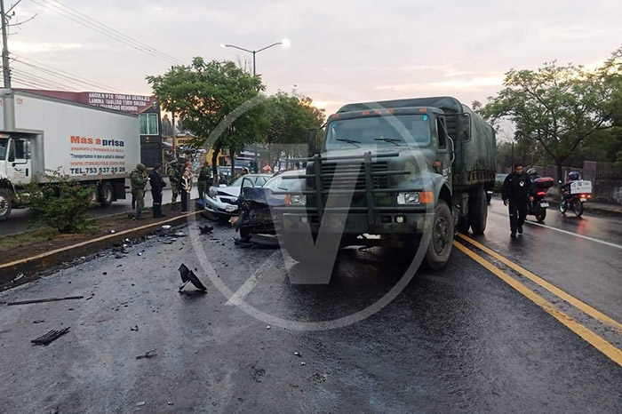 Morelia, Michoacán. Dos vehículos particulares y un camión militar protagonizaron un aparatoso choque sobre la avenida Madero Poniente de Morelia, el cual dejó dos personas lastimadas, informaron autoridades policiales.