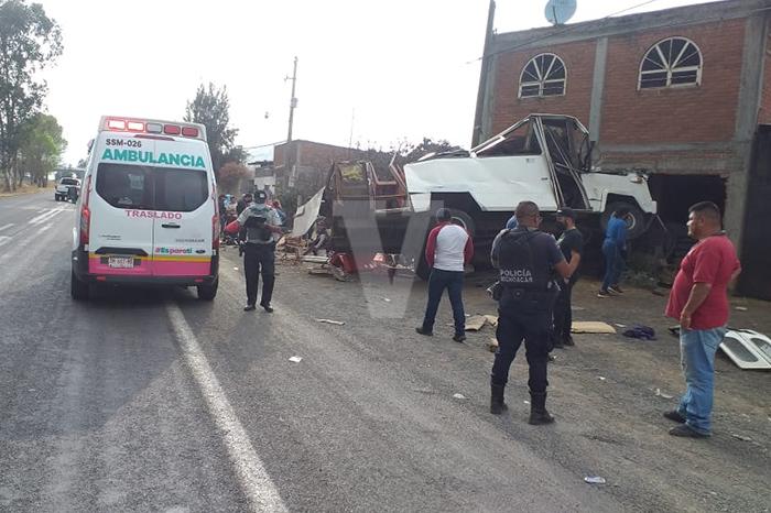 Redacción / La Voz de Michoacán Huiramba, Michoacán. Un tráiler embistió a un camión de transporte de personal y lo proyectó contra un inmueble en "obra negra", el hecho se registró en la carretera Morelia-Pátzcuaro y a consecuencia de la situación hubo tres muertos y nueve lesionados, entre las víctimas hay ocupantes del automotor chocado y peatones que fueron atropellados. El acontecimiento fue en el kilómetro 35+500 en la población de El Carmen, localizada en este municipio de Huiramba. La emergencia fue atendida por los socorristas de la región y por los efectivos del Batallón de Seguridad en Carreteras e Instalaciones de la Guardia Nacional. El chofer del vehículo de carga que generó el accidente huyó con su unidad. Los lastimados fueron atendidos por los paramédicos de la Coordinación Estatal de Protección Civil, de Ambumed, de Protección Civil de Huiramba, de Acuitzio y del Centro Regulador de Urgencias Médicas. El automotor de transporte de personal terminó destrozado, es uno de la marca Ford, modelo 1992, de color blanco. La identidad de los ahora occisos es desconocida, así como la de los lastimados, éstos últimos fueron trasladados a hospitales del área. Los expertos de la Fiscalía General del Estado llegaron al sitio y se encargaron de los peritajes respectivos para luego llevar los cuerpos sin vida a la morgue y emprender la carpeta de investigación respectiva. Foto: La Voz de Michoacán. Foto: La Voz de Michoacán. Foto: La Voz de Michoacán. Foto: La Voz de Michoacán.