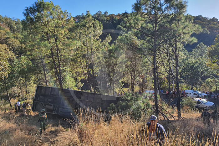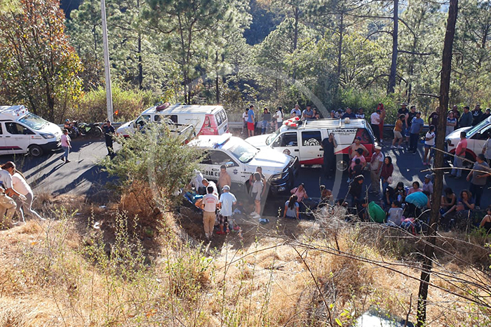 Redacción / La Voz de Michoacán Tacámbaro, Michoacán. Una persona muerta y 28 peregrinos lesionados, fue el que dejó la volcadura del autobús en el que regresaban un grupo de peregrinos, después de visitar el templo del Cristo Negro en Carácuaro. El accidente se registró la tarde de este domingo, cuando el conductor de un autobús de la línea Occidente, con placas 113718HR, salió del municipio de Carácuaro, donde los feligreses visitaron al milagroso Cristo Negro. Foto: La Voz de Michoacán. Todo transcurría con normalidad, pero al circular por la carretera Carácuaro-Tacámbaro a la altura del sitio conocido como “La Cuesta”, el conductor perdió el control, volcó y terminó por fuera de la carretera recostado sobre su lado izquierdo. Al sitio se movilizaron de forma inmediata paramédicos de Protección Civil Municipal, Guardia Civil, Tránsito Municipal, Radio Auxilio y personal militar del 6to Batallón de Infantería, para otorgar ayuda. De inmediato los soldados y socorristas auxiliaron a los 27 peregrinos heridos y los trasladaron al hospital del IMSS de Tacámbaro, al Hospital de Carácuaro y clínicas particulares para su adecuada atención médica. Foto: La Voz de Michoacán. Más tarde las autoridades confirmaron que lamentablemente uno de los ocupantes del camión fue hallado muerto, prensado entre los hierros retorcidos, siendo ignorada hasta el momento su identidad. Personal de vialidad se hizo cargo de realizar los correspondientes peritajes, mientras que los agentes y peritos de la Fiscalía General del Estado emprendieron las diligencias de ley y posterior levantamiento del cadáver. A continuación, el listado de los lesionados: -Maricela Rosales Oros de 45 años, originaria de la población Opopeo -Cecilia Arévalo Molinero, de 26 años, originaria de Opopeo -María de los Ángeles Chávez Chávez de 29 años, originaria de Uruapan -Ángel Rafael Ramos Chávez de 9 meses, originario de Uruapan -Lucila Barajas Bautista de 28 años, originaria de Pichátaro -Guadalupe Ramos Gerónimo de 51 años, originaria de Pichátaro -José Mario Galván - Garfías de 28 años, originario de Tacámbaro -Camerina Alejandre Peñaloza de 55 años, originaria de Pátzcuaro -Anastasio Cornejo Arreola de 83 años -Juan Iván Báez Esquivel de 12 años, originario de Pátzcuaro. -Francisco Días de 42 años. -Evelin Báez Esquivel de 15 años. -Juan Báez Torres de 43 años. -Juan Carlos Galván de 21 años. -Maxieli Arlen Ponce de 17 años. -Martha Ponce Contreras de 51 años. -Leobardo Quirino Ángel de 88 años. -Mario Juárez Guillen. -María Soledad Rosales Jiménez. -Carmela Jiménez García. -Pilar Quirino Cristóbal de 57 años. -Héctor Cristóbal Cortés de 63 años. -Marcos Bedolla Bedolla de 38 años. -Alva Karina Corona. -Rodríguez de 28 años. -Jorge Eduardo Ramos. -Gerónimo de 29 años. -Agustín Ramírez. -Francisco de 45 años. -Bella Camila Díaz. -Martínez de 12 años. Si algún familiar de los heridos requiere cualquier información puede marcar al 911. Foto: La Voz de Michoacán.