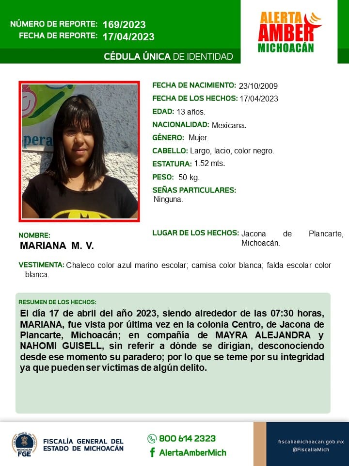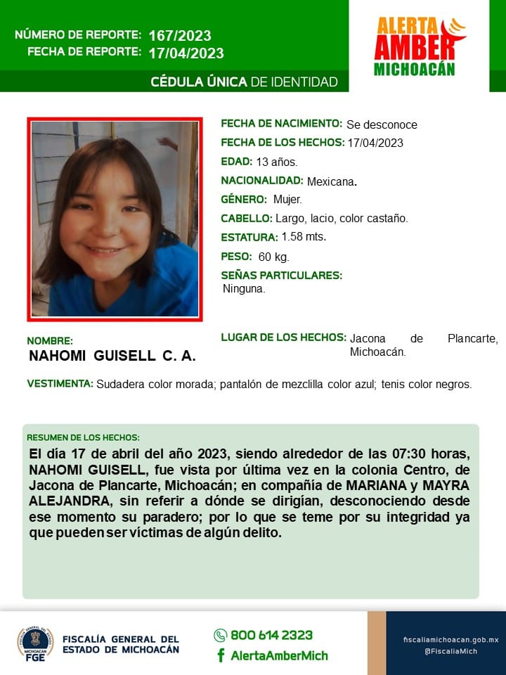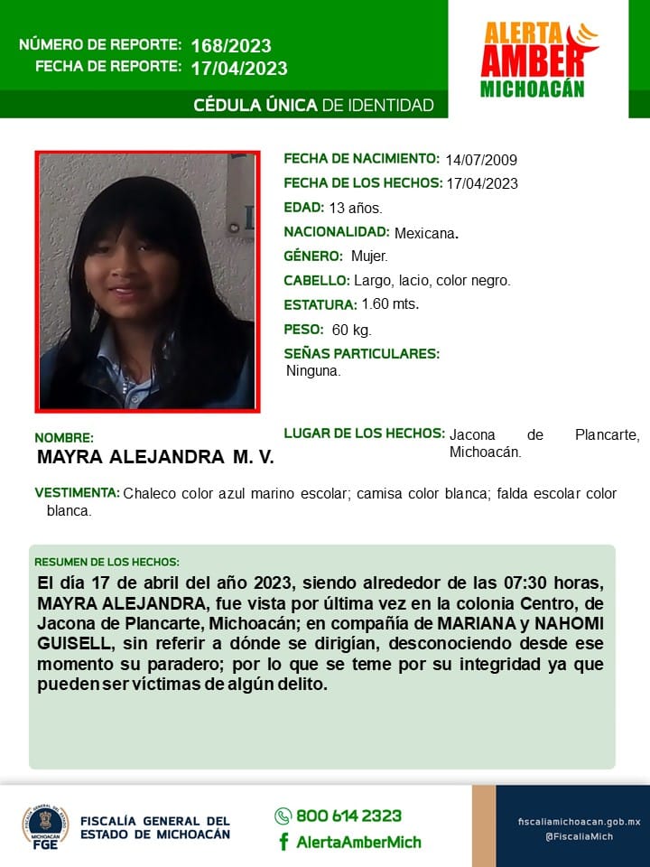 Redacción / La Voz de Michoacán Jacona, Michoacán. La Fiscalía General del Estado, emitió tres fichas de búsqueda mediante Alerta Amber, para localizar a tres menores de 13 años edad reportadas como desaparecidas en el municipio de Jacona. Por los datos emitidos en las citadas fichas se sabe que de las tres adolescentes se desconoce su paradero desde las 07:30 horas del pasado lunes 17 de abril, cuando fueron vistas en zona centro de dicha demarcación. Se trata de Mayra Alejandra M. V., de 1.60 metros de altura, 60 kilogramos de peso, así como Mariana M. V., de 1.52 metros de altura, 50 kilogramos de peso, ambas visten chaleco escolar de color azul marino, camisa y falda escolar de color blanco. Mientras que la tercera menor es Nahomi Guisell C. A., quien según su ficha de búsqueda viste una sudadera morada, pantalón de mezclilla y tenis negros. Según refieren las autoridades, se teme por su integridad ya que pueden ser víctimas del algún delito, por lo que se solicita la colaboración de la ciudadanía reportando cualquier información que pueda llevar a su localización al número 800 614 23 23.