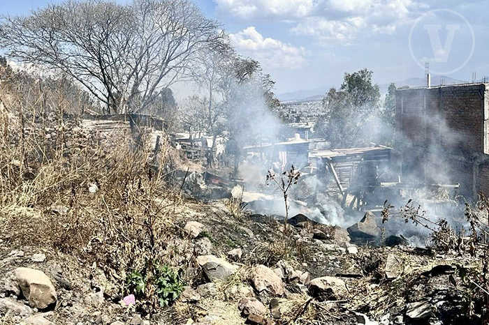 Redacción / La Voz de Michoacán Morelia, Michoacán. Un domicilio de madera terminó devastado por un incendio en la colonia Cumbres del Quinceo, perteneciente a la ciudad de Morelia, informaron autoridades de rescate, las cuales mencionaron que no hubo personas lesionadas ni fallecidas, únicamente daños materiales. La quemazón se registró durante la tarde de este viernes en la referida vivienda, localizada sobre la calle Juan de la Barrera. Fueron vecinos del lugar quienes reportaron el siniestro al número de emergencias y solicitaron ayuda. Foto: La Voz de Michoacán. Posteriormente arribaron bomberos de la Coordinación Estatal de Protección Civil Michoacán (CEPCM), quienes combatieron las llamas y finalmente lograron sofocarlas. Lamentablemente, el inmueble terminó destruido. Hasta el momento se desconoce cómo inició el fuego, comentaron las fuentes. Foto: La Voz de Michoacán.