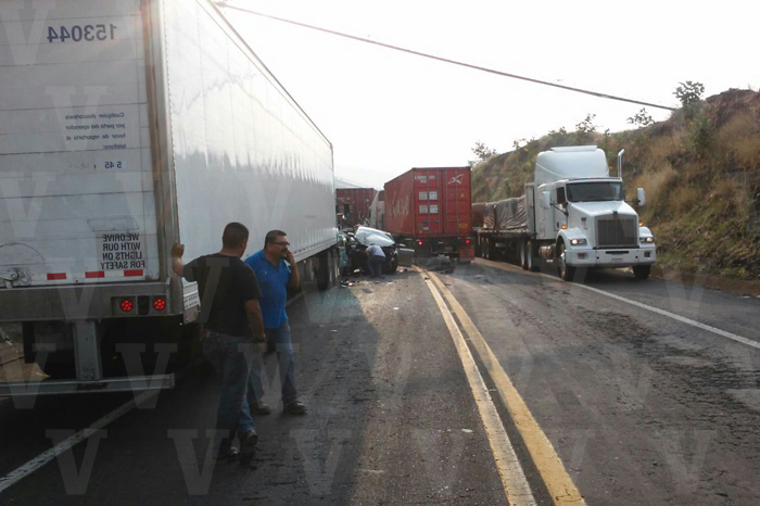 Redacción/La Voz de Michoacán San Ángel Zurumucapio. Un tráiler impactó a cinco vehículos y a otro tractocamión y al chocar contra éste último frenó su carrera, lo cual dejó como saldo cinco personas heridas. El accidente fue en la autopista “Siglo XXI” en esta demarcación. Un elemento de la Procuraduría General de Justicia (PGJ) se percató de que el camionero trataba de huir y lo capturó, de acuerdo con los datos obtenidos por esta redacción. El percance fue la tarde de este jueves, a la altura del kilómetro 88 del tramo carretero Uruapan-Pátzcuaro. El tráiler que provocó la carambola es uno de la marca Kenworth, impactó a una camioneta Jeep, de color guinda; a una Toyota pick-up, de color blanco; a un Volkswagen Jetta, de color blanco; a otro Jetta, pero de color plata y a un coche de color gris, así como a otro camión. De las personas que resultaron lastimadas se desconocen sus generales, su edad y su sexo, ya que fueron atendidas y canalizadas de inmediato a un nosocomio privado de la ciudad de Uruapan, mencionaron contactos oficiales. https://twitter.com/SdeGobMich/status/999812586903289856 La emergencia fue cubierta por los paramédicos de Rescate y Salvamento, de Protección Civil y por los elementos de la Policía Federal de la División de Seguridad Regional (DSR) y de la Policía Michoacán. Fuentes policiacas detallaron que el tráiler que chocó contra las demás unidades automotrices transitaba con dirección a Uruapan. El acontecimiento fue a un kilómetro y medio de la caseta de la población de San Ángel Zurumucapio. Asimismo, se supo en la labor periodística que un oficial de la PGJ arrestó al trailero presunto responsable de los hechos, cuando éste trataba de darse a la fuga, momento en que fue entregado a los agentes federales de la DSR para que fuera puesto a disposición de la representación social para que ésta le defina su situación legal.