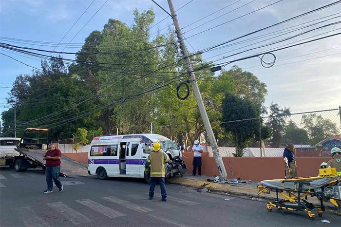 Redacción / La Voz de Michoacán Morelia, Mich.- Miércoles 12 de junio de 2024.- El conductor de una combi Ruta Morada 1 quedó lesionado tras chocar contra un poste de concreto en la colonia Lomas del Valle, en Morelia, informaron autoridades policiales. El percance sucedió durante la mañana de este miércoles sobre la calle Loma del Rey, justo al exterior de la Escuela Primaria Presidente Lázaro Cárdenas. Trascendió que el trabajador del volante no llevaba pasaje, perdió el control de su unidad y se estrelló contra el poste, el cual no colapsó debido al cableado que lo sostuvo. Bomberos estatales atendieron la emergencia y con sus herramientas liberaron al chofer qué estaba atrapado en la cabina, después unos paramédicos lo canalizaron a un hospital para su valoración médica. Unos oficiales de Tránsito se encargaron del peritaje correspondiente y personal de la CFE fue alertado sobre el poste dañado. Por último, una grúa retiró el vehículo siniestrado.