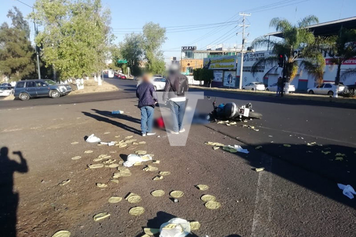 Redacción / La Voz de Michoacán Morelia, Michoacán. Dos motociclistas resultaron malheridos al momento de protagonizar un aparatoso choque sobre el Periférico Paseo de la República, en la zona oriente de Morelia, informaron fuentes policiales. El accidente ocurrió la mañana de este lunes, a la altura de la colonia El Mirador del Punhuato, a pocos metros del negocio Galerías El Triunfo y en las inmediaciones del crucero salida a Charo. Se apreció que una de las motos transportaba varios kilos de tortillas, los cuales terminaron regados en el asfalto. Foto: La Voz de Michoacán. El hecho fue reportado al número de emergencias 911, entonces acudieron unos paramédicos, quienes auxiliaron a los afectados; la identidad de los pacientes no fue expuesta. En el sitio también se presentaron unos patrulleros de Tránsito, mismos que realizaron el peritaje correspondiente para deslindar responsabilidades. Por último, una grúa retiró los motociclos siniestrados.
