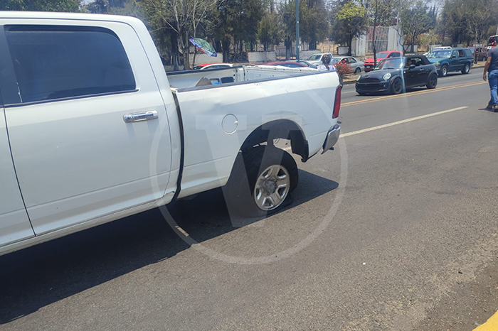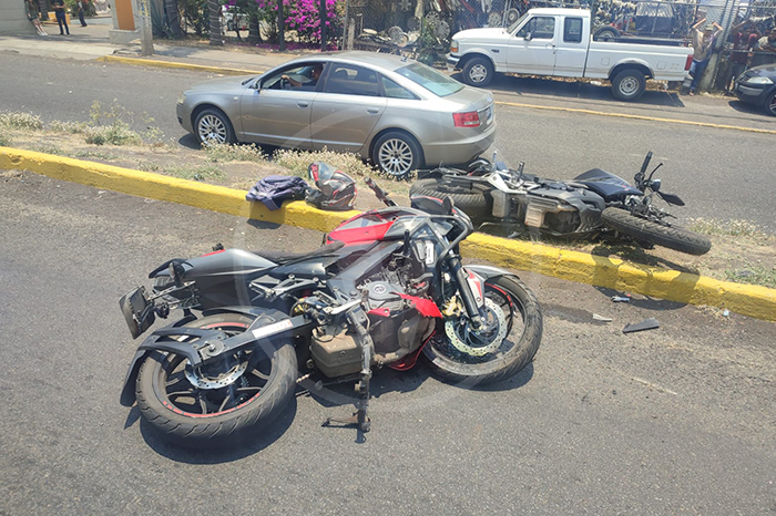 Redacción / La Voz de Michoacán Morelia, Michoacán. Una camioneta presuntamente perteneciente a alguna corporación policial que circulaba sobre la salida a Quiroga, impactó a dos motocicletas, dejando como saldo dos lesionados. El accidente vehicular tuvo lugar sobre la avenida Madero Poniente, a la altura de la desviación a Cointzio, donde varias personas que se encontraban en la zona se aproximaron para abanderar el área y evitar que ocurriera otro percance. Foto: La Voz de Michoacán. Mientras que, al enterarse de la situación, se trasladaron paramédicos de Ambumed y elementos de Tránsito y Movilidad de la Guardia Civil, los cuales a su llegada observaron una camioneta Dodge tipo Pick Up, de doble cabina, de color blanco, sin placas de circulación, ni balizado oficial, pero que cuenta con códigos policiales. A unos metros los oficiales encontraron dos motocicletas siniestradas, una de color rojo y otra negra, cuyos ocupantes resultaron heridos, por lo que fueron auxiliados por los socorristas y canalizados a un hospital para su adecuada atención médica. Foto: La Voz de Michoacán. Personal de Tránsito y Movilidad se encargó de realizar los peritajes correspondientes a fin de determinar responsabilidades, siendo aseguradas y remolcadas a un corralón las unidades involucradas. Se mencionó en un primer momento que la camioneta seria de la Fiscalía General del Estado, sin embargo fuentes al interior de la dependencia confirmaron que no corresponde a ningún vehículo registrado en su padrón vehícular.