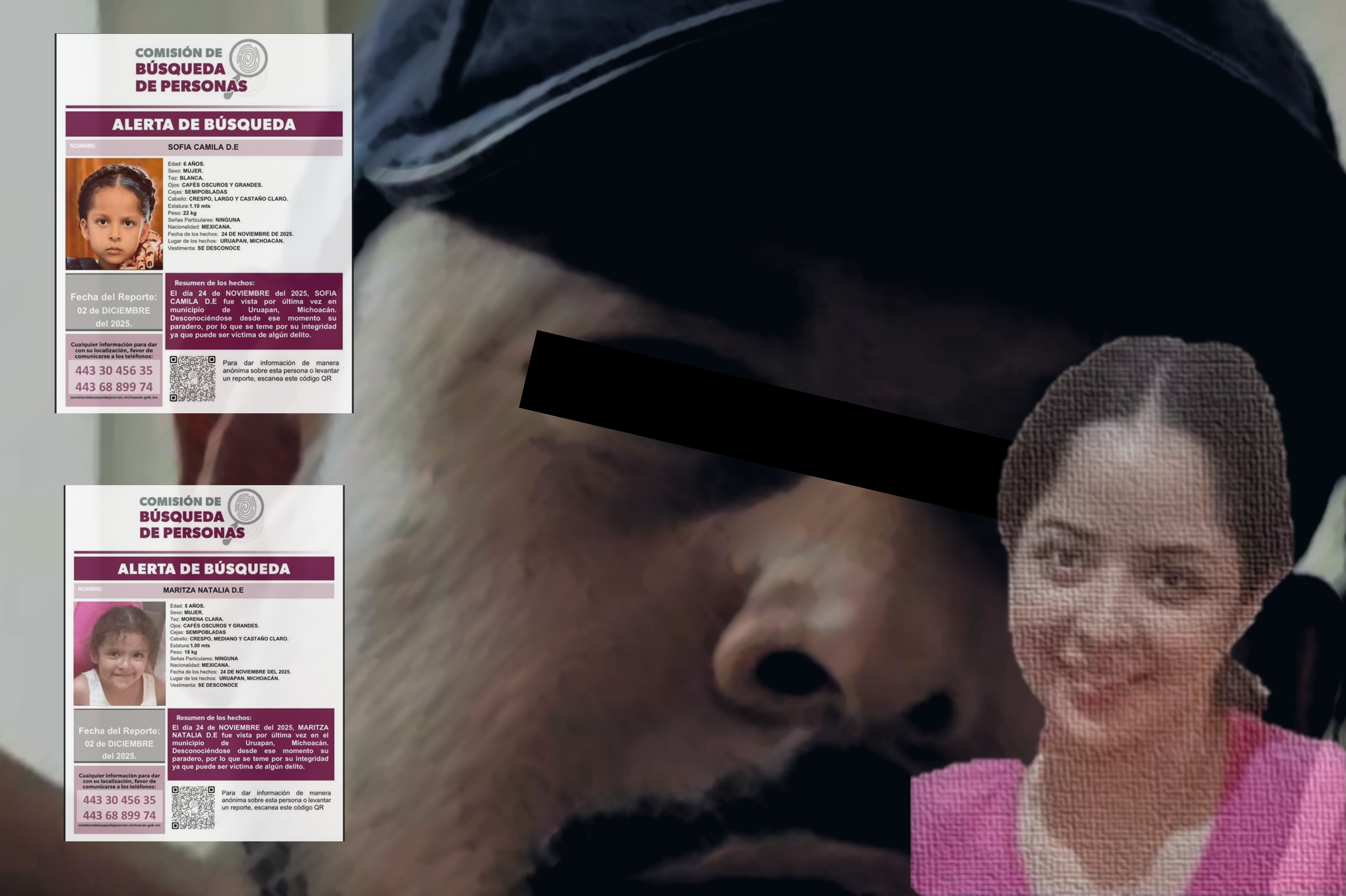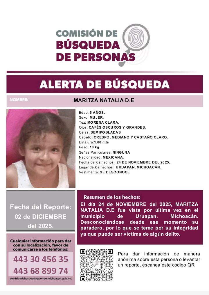 Omar Cuiriz / La Voz de MichoacánMorelia, Michoacán.- Sofia Camila de 6 años y Maritza Natalia de 4 años deben ser encontradas con vida y a la brevedad, es la exigencia de los familiares quienes han convocado a una marcha para presionar a las autoridades que se dé con su paradero y se haga justicia por el asesinato de la madre de ambas menores. La madre Maritza Espino Ponce y sus hijas fueron vistas por última vez el pasado lunes 24 de noviembre. Fue hasta el sábado 29 que ella fue encontrada sin vida con huellas de arma de fuego en un río de la ciudad de Uruapan y de las menores no se sabe nada hasta el momento. En redes sociales, colectivos feministas han compartido que el próximo domingo 7 de diciembre, en la ciudad de Morelia, se realizará una marcha pacífica a las 10 de la mañana partiendo de Las Tarascas hacía Palacio de Gobierno.Piden a los asistentes que vistan de color morado.Así mismo en redes sociales y trasciende que existen denuncias previas y pruebas que señalan directamente a su pareja sentimental quien presuntamente se habría negado a darle el divorcio y la amenazaba con hacerle daño. Familiares directos de Maritza Espino han publicado en redes que temen por las menores: “Pero el miedo no me va a parar para exigir que se haga justicia por Maritza y que se entreguen sanas y salvas a las niñas por qué nos faltan #SofiayNatalia les invito a participar en la marcha pacífica para pedir justicia por mi hermana y mis sobrinas”, se lee en la cuenta de su hermana. Este jueves el fiscal general del estado, Carlos Torres Piña, indicó la pareja sentimental de ella está involucrada con el deceso de Maritza y sería quien tenga a las niñas. Torres Piña indicó que desde el domingo 30 se realizan investigaciones para dar con el paradero del inculpado, así como de Sofia Camila y Maritza Natalia y que ya hay una alerta nacional. “Solicitamos las alertas respectivas a nivel nacional sobre las dos menores para reforzar la búsqueda y seguiremos trabajando con las áreas y fiscalías correspondientes para poder dar con el paradero de las menores”, señaló. Maritza Espino fue localizada en el río Santa Bárbara, a la altura del Camino Real a Santa Catarina, en la colonia 18 de Marzo de la ciudad de Uruapan. De acuerdo con información periodística, se le apreciaron lesiones de proyectil de arma de fuego. ALERTAS DE BÚSQUEDA