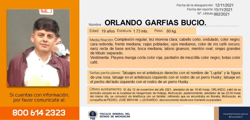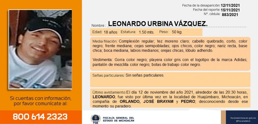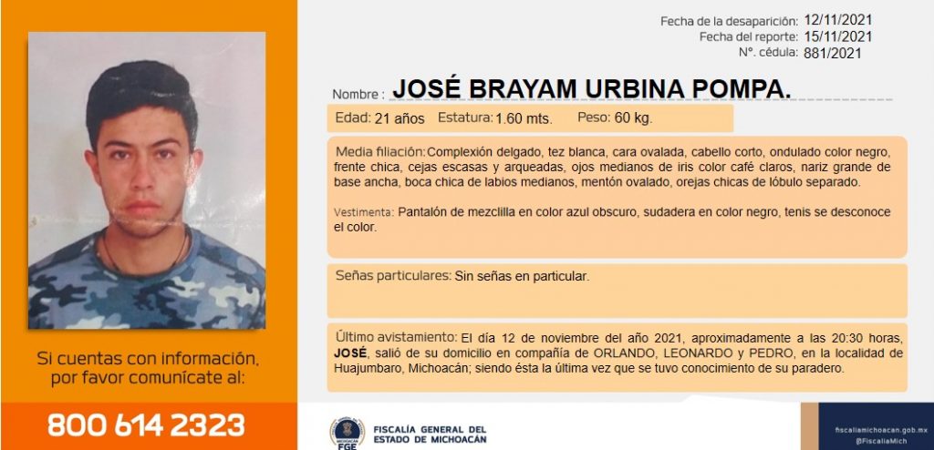 Redacción / La Voz de Michoacán Morelia, Michoacán.- El pasado 12 de noviembre de 2021, Leonardo, José Brayam y Orlando salieron de sus domicilios ubicados en la localidad de Huajúmbaro de Hidalgo, Michoacán alrededor delas 20:00 horas. Orlando se comunicó con un familiar esa misma noche y avisó que se encontraban en Morelia, capital del estado de Michoacán. Esa fue la última vez que se tuvo conocimiento del paradero de los tres jóvenes por lo que sus familiares piden desesperadamente que los ayuden localizarlos y a difundir las fichas de búsqueda. Se sabe que los jóvenes ya se dirigían a sus casas sobre la carretera Morelia-Zinapecuaro, en una camioneta Hyundai 2016, color gris. Si usted tiene datos que ayuden a dar con su paradero, comuníquese a: 800 614 2323