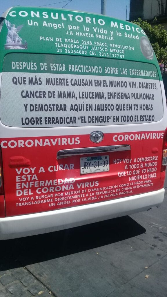 Redacción / La Voz de Michoacán Tlaquepaque, Jalisco. Un falso doctor que anunciaba curar el coronavirus fue detenido este lunes por la Policía de Tlaquepaque, Jalisco, toda vez que no contaba con el permiso para publicitarse ni cédula profesional. El septuagenario sujeto circulaba en una camioneta Toyota con rótulos y perifoneo sobre las calles Independencia y Obregón, en las cercanías de El Parían, donde aseguraba curar todo tipo de enfermedades. Sin embargo, los uniformados le solicitaron el permiso municipal para publicitarse y no contaba con el documento. Además carecía de cédula profesional que lo acreditara como médico, por lo consiguiente fue remitido a los juzgados municipales al tratarse de una falta administrativa. A Juan Ángel, de 76 años, también le fue clausurado su consultorio ubicado en el fraccionamiento Revolución al carecer de los permisos de la COFEPRIS y del propio Ayuntamiento como giro comercial.