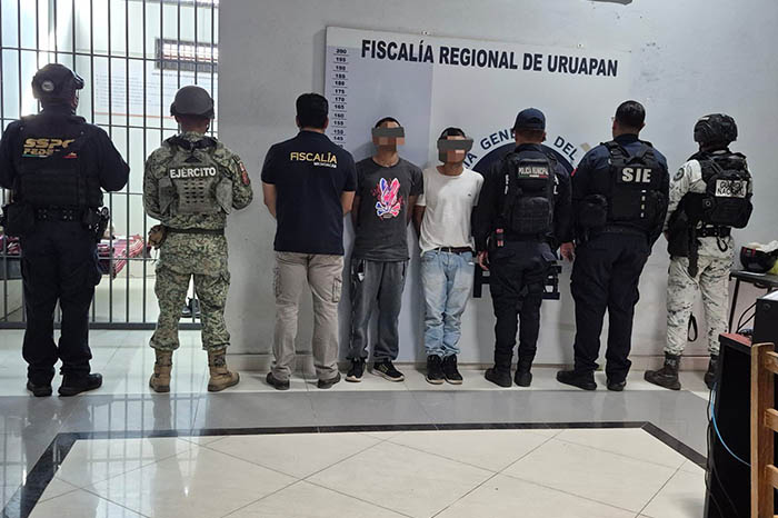 Uruapan, Michoacán. Elementos de la Fiscalía General del Estado (FGE), Guardia Civil, Secretaría de Seguridad y Protección Ciudadana (SSPC), Defensa y Policía Municipal de Uruapan detuvieron a dos hombres acusados de homicidio calificado durante un operativo en la colonia San Rafael, al oriente de la ciudad.