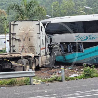 Redacción / La Voz de Michoacán Morelia, Michoacán. La mañana de este martes se registró un fuerte choque en la autopista Pátzcuaro-Copándaro, en el que hubo personas fallecidas. Los vehículos involucrados son un tráiler y un autobús. De acuerdo con los primeros reportes, el trágico accidente ocurrió sobre el kilómetro 57+050, antes de las 7 de la mañana, en el llamado Libramiento Morelia, donde ambas unidades protagonizaron el percance, cerca del parador turístico y de la estación de servicio de combustible. Al lugar acudieron paramédicos, quienes confirmaron el deceso de dos personas y se valora el estado de salud de al menos 11 lesionados. En la zona del accidente ya se encuentra personal de la Fiscalía General del Estado de Michoacán, realizando las primera diligencia pertinentes, para luego llevar los cadáveres Servicio Médico Forense. Respecto a la circulación vial, la Secretaría de Infraestructura, Comunicaciones y Transportes (SICT), delegación Michoacán, notifica que hay paso alterno.
