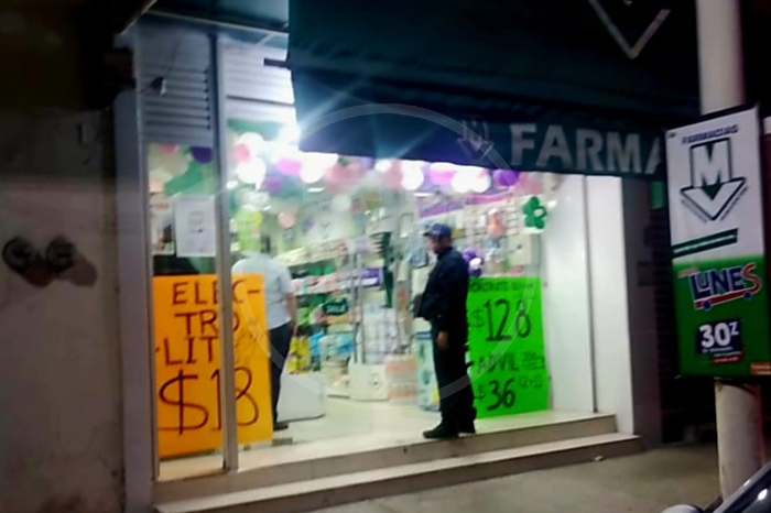 Redacción / La Voz de Michoacán Apatzingán, Michoacán. Un solitario pistolero irrumpió en una farmacia en la zona Centro de Apatzingán, donde amagó a los trabajadores con detonar una granada para que le entregaran el dinero en efectivo que había en las cajas. Fue una denuncia ciudadana realizada al personal del SITEC, la que alertó a los elementos de la Policía Municipal, sobre un violento atraco en la farmacia MV, ubicada en la avenida Constitución de 1814. En el sitio los uniformados fueron informados de que minutos antes un sujeto pistola en mano amenazó a las personas dentro del comercio y sacó una granada con que amagó con detonar si no le entregaban el dinero que tuvieran, por lo que las víctimas el dieron 8 mil pesos que había en las cajas, tras lo cual el delincuente escapó corriendo. Los oficiales se desplegaron en calles y colonias aledañas en busca del maleante, sin que lograran ubicarlo, por lo que recomendaron a los afectados acudir ante la Fiscalía General del Estado para interponer la correspondiente denuncia. Foto: Cortesía.