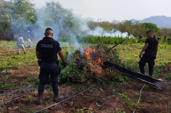 Redacción / La Voz de Michoacán Tumbiscatío, Michoacán. En continuación al operativo interinstitucional que mantienen los elementos de la Secretaría de Seguridad Pública (SSP) en la entidad, se localizaron y destruyeron dos plantíos de marihuana en Tumbiscatío. En coordinación con autoridades Secretaría de la Defensa Nacional (SEDENA), y Guardia Nacional (GN), tras efectuar recorridos de reconocimiento sobre la brecha que conduce de Tumbiscatío a Arteaga, los agentes de la Policía Michoacán localizaron e incineraron dos plantíos de marihuana. Las tareas operativas para la prevención y disuasión del delito no cesan en todo el territorio estatal, asimismo las labores conjuntas con los tres órdenes de gobierno se mantienen permanentes a fin de brindar las garantías de seguridad y tranquilidad a la población.