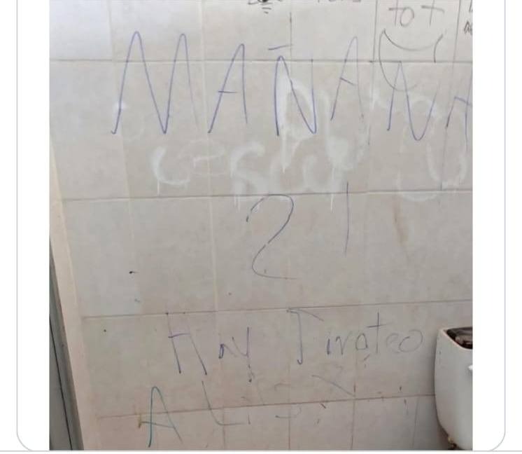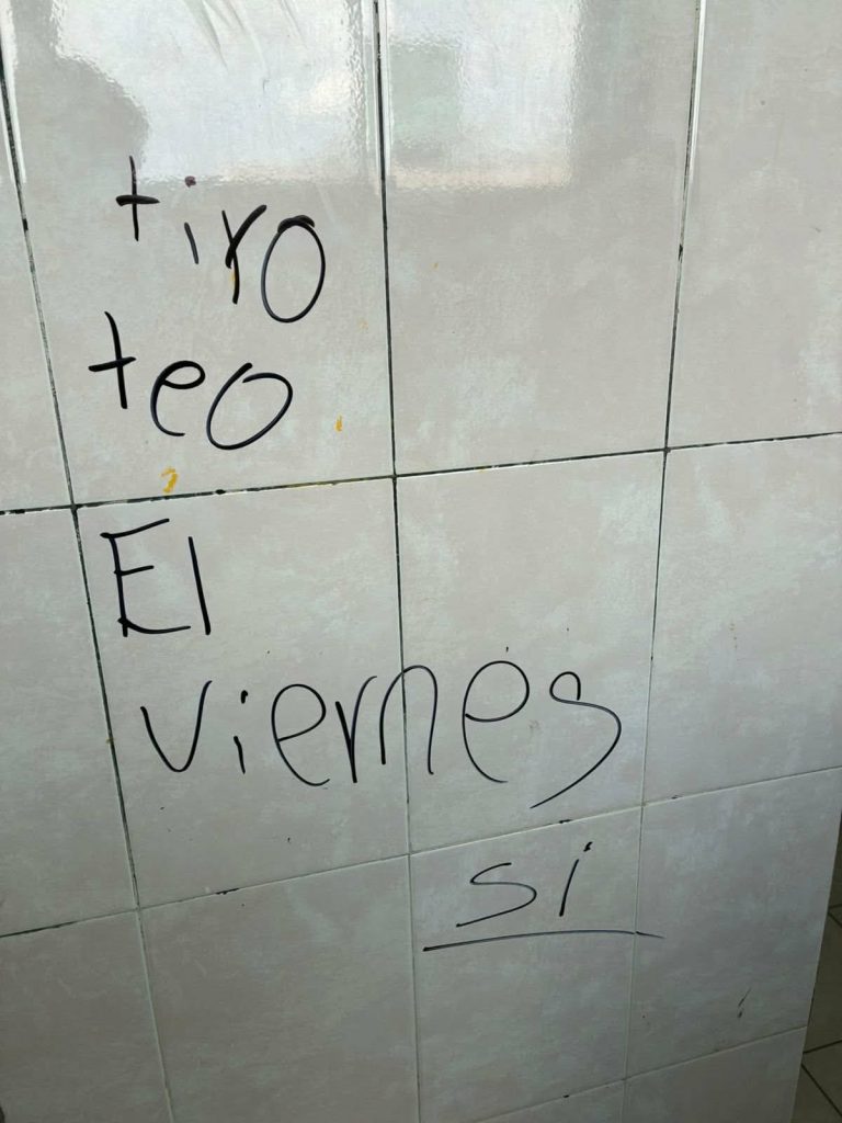 Se trata de leyendas escritas en los baños de hombres de las instituciones, en las que se pueden leer la palabra “tiroteo” con el presunto día que se realizarían, los cuales serían los días 21, 22 y 23 de abril.
