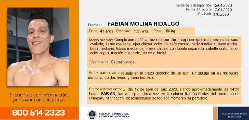 Redacción / La Voz de Michoacán Uruapan, Michoacán. Este jueves la Fiscalía General del Estado (FGE) emitió una ficha de búsqueda del dueño de un negocio de suplementos alimenticios y fisicoculturista que fue raptado por sujetos que previamente ultimaron a tiros a a otro hombre, el miércoles de la semana pasada en la colonia Ramón Farías. Como se mencionó, el pasado miércoles 12 de abril, sujetos que portaban armas largas asesinaron a un hombre en la esquina de las calles Monterrey y Michoacán, por fuera de un negocio con venta de suplementos alimenticios y plagiaron al propietario, identificado como Fabián Molina Hidalgo, de 43 años de edad. A una semana del incidente en que se desconoce el paradero de esta persona sus familiares denunciaron la situación y la FGE emitió la ficha de búsqueda. En la ficha se menciona que Fabián fue visto por última vez el pasado 12 de abril, a las 14:30 horas, en la colonia Ramón Farías, y desde entonces se desconoce su paradero, por lo cual se invita a cualquier ciudadano que pudiera tener información al respecto que se acerque a las oficinas de la fiscalía para informar de ese dato.